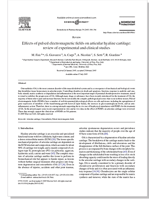 Controlling chondrocyte death and apoptosis, function, response to anabolic and catabolic stimuli, matrix synthesis or degradation and inflammation is the most important target of potential chondroprotective treatment, aimed to retard or stabilize the progression of OA. Although many drugs or substances have been recently introduced for the treatment of OA, the majority of them relieve pain and increase function, but do not modify the complex pathological processes that occur in these tissues. Pulsed electromagnetic fields (PEMFs) have a number of well-documented physiological effects on cells and tissues including the upregulation of gene expression of members of the transforming growth factor b super family, the increase in glycosaminoglycan levels, and an antiinflammatory action. Therefore, there is a strong rationale supporting the in vivo use of biophysical stimulation with PEMFs for the treatment of OA. In the present paper some recent experimental in vitro and in vivo data on the effect of PEMFs on articular cartilage were reviewed. These data strongly support the clinical use of PEMFs in OA patients.