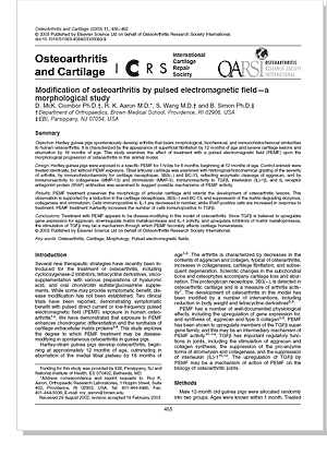 Objective: Hartley guinea pigs spontaneously develop arthritis that bears morphological, biochemical, and immunohistochemical similarities to human osteoarthritis. It is characterized by the appearance of superficial fibrillation by 12 months of age and severe cartilage lesions and eburnation by 18 months of age. This study examines the effect of treatment with a pulsed electromagnetic field (PEMF) upon the morphological progression of osteoarthritis in this animal model.