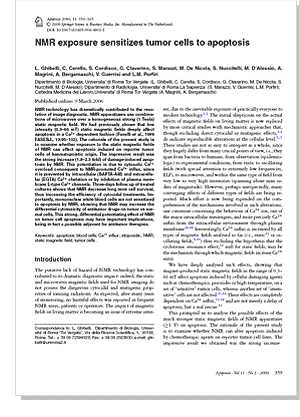 field. We had previously shown that low intensity (0.3–66 mT) static magnetic fields deeply affect apoptosis in a Ca2+ dependent fashion (Fanelli et al., 1999 FASEBJ., 13;95–102). The rationale of the present study is to examine whether exposure to the static magnetic fields of NMR can affect apoptosis induced on reporter tumor cells of haematopoietic origin. The impressive result was the strong increase (1.8–2.5 fold) of damage-induced apoptosis by NMR. This potentiation is due to cytosolic Ca2+ overload consequent to NMR-promoted Ca2+ influx, since it is prevented by intracellular (BAPTA-AM) and extracellular (EGTA) Ca2+ chelation or by inhibition of plasma membrane L-type Ca2+ channels. Three-days follow up of treated cultures shows that NMR decrease long term cell survival, thus increasing the efficiency of cytocidal treatments. Importantly, mononuclear white blood cells are not sensitised to apoptosis by NMR, showing that NMR may increase the differential cytotoxicity of antitumor drugs on tumor vs normal cells. This strong, differential potentiating effect of NMR on tumor cell apoptosis may have important implications, being in fact a possible adjuvant for antitumor therapies.