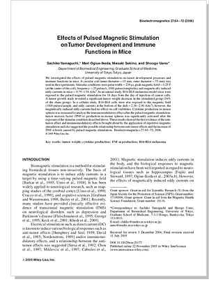 We investigated the effects of pulsed magnetic stimulation on tumor development processes and immune functions in mice. A circular coil (inner diameter¼15 mm, outer diameter¼75 mm) was