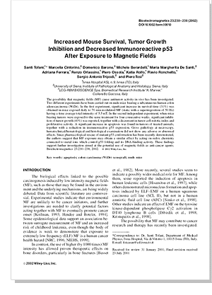 colon adenocarcinoma (WiDR). In the first experiment, significant increase in survival time (31%) was obtained in mice exposed daily to 70 min modulated MF (static with a superimposition of 50 Hz) having a time average total intensity of 5.5 mT. In the second independent experiment, when mice bearing tumors were exposed to the same treatment for four consecutive weeks, significant inhibition of tumor growth (40%) was reported, together with a decrement in tumor cell mitotic index and proliferative activity. A significant increase in apoptosis was found in tumors of treated animals, together with a reduction in immunoreactive p53 expression. Gross pathology at necroscopy, hematoclinical/hematological and histological examination did not show any adverse or abnormal effects. Since pharmacological rescue of mutant p53 conformation has been recently demonstrated, the authors suggest that MF exposure may obtain a similar effect by acting on redox chemistry connected to metal ions which control p53 folding and its DNA-binding activity. These findings support further investigation aimed at the potential use of magnetic fields as anti-cancer agents.