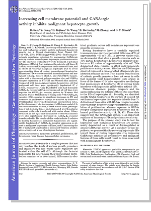 Increasing hepatocyte membrane potentials by augmenting GABAergic activity inhibits nonmalignant hepatocyte proliferative activity. The objectives of this study were to document 1) potential differences (PDs) of four malignant hepatocyte cell lines, 2) GABAA receptor mRNA expression in the same cell lines, and 3) effects of restoring malignant hepatocyte PDs to levels approximating those of resting, nonmalignant hepatocytes. Hepatocyte PDs were documented in nonmalignant and malignant (Chang, HepG2, HuH-7, and PLC/PRF/5) hepatocytes with a fluorescent