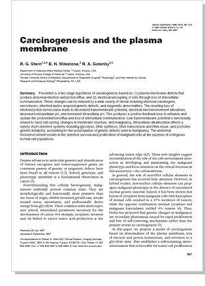 epigenetic abnormalities. The resulting loss of electron/proton homeostasis leads to decreased transmembrane potential, electrical microenvironment alterations, decreased extracellular pH, and increased intracellular pH. This produces a positive feedback loop to enhance and sustain the proton/electron efflux and loss of intercellular communication. Low transmembrane potential is functionally related to rapid cell cycling, changes in membrane structure, and malignancy. Intracellular alkalinization affects a variety of pH-sensitive systems including glycolysis, DNA synthesis, DNA transcription and DNA repair, and promotes genetic instability, accounting for the accumulation of genetic defects seen in malignancy. The abnormal microenvironment results in the selective survival and proliferation of malignant cells at the expense of contiguous normal cell populations.